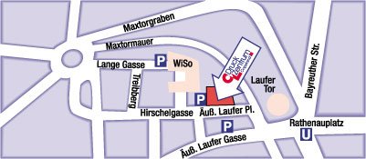 Unsere Produktionsstätten und Copy-Center in der Innenstadt sind bequem ab der U-Bahn- Haltestelle "Rathenauplatz" innerhalb von 2 Minuten (50m vom Einwohnermeldeamt (Passamt) Nürnberg entfernt, direkt bei der Uni Nürnberg), bzw. 5 Minuten (Hirschelgasse) zu erreichen.